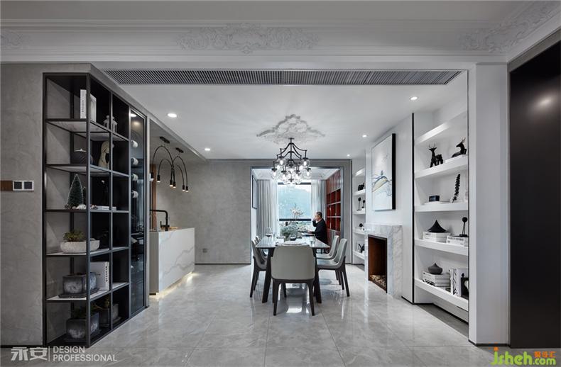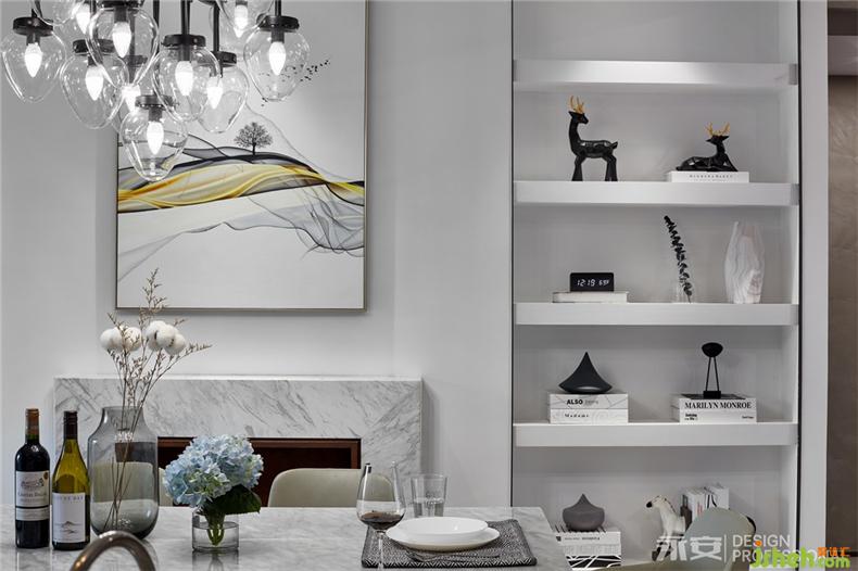 餐飲除了是生活必備部分以外更是一種交際和情感交流的區(qū)域,因此設(shè)計(jì)師對(duì)整體布局做了大的調(diào)整,不論是客餐廳還是休閑空間的布局都得到了釋放,而且還增加了島臺(tái)區(qū)域空間分配了中西餐櫥。室內(nèi)設(shè)計(jì)師被得以釋放的空間更是得到了最好光照亮度和視線(xiàn)景色。餐廳配以石膏雕花、頂燈是一個(gè)錯(cuò)落的橢圓形燈組,雕花、燈桿和燈珠恰恰處于餐桌中間點(diǎn),十分巧妙。傳統(tǒng)壁爐的演繹變化,它與書(shū)柜形成了良好的互動(dòng),為生活增添了許多審美的元素,增加了生活樂(lè)趣。裝修公司