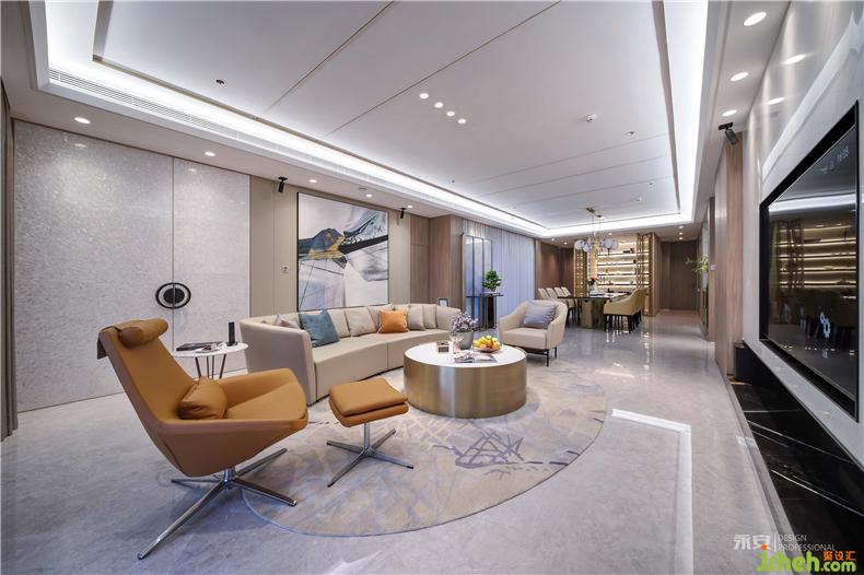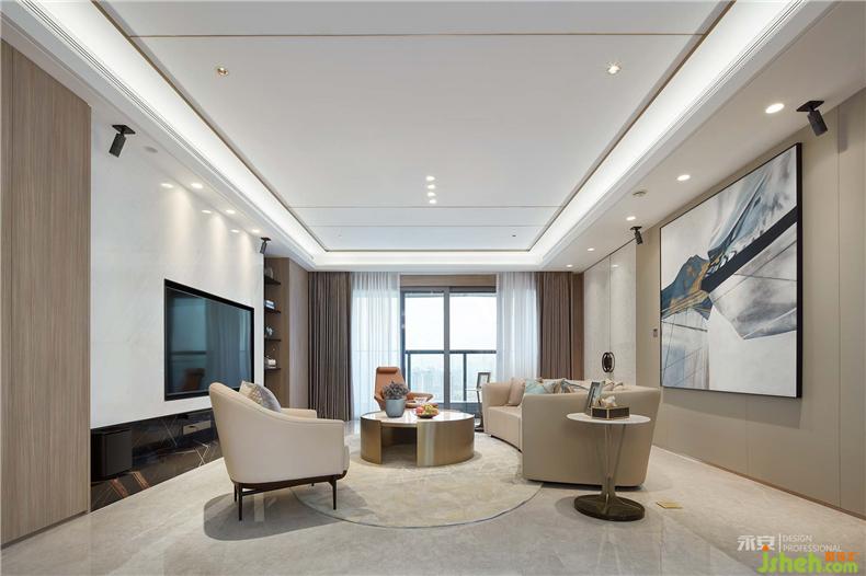 客廳區(qū)域采用符合當(dāng)代簡(jiǎn)約風(fēng)的無(wú)主燈設(shè)計(jì),智能化的光照系統(tǒng)與燈帶、筒燈相結(jié)合,在設(shè)計(jì)師對(duì)光源分布距離的合理配置下,它們可以根據(jù)不同的情境、主人的不同需求,調(diào)整燈光的明暗層次,營(yíng)造出更為舒適的空間氛圍。室內(nèi)設(shè)計(jì)師與此同時(shí),區(qū)域內(nèi)的金屬家具、石材,也在全范圍、多層次的燈光漫反射效果下,呈現(xiàn)出更具低奢質(zhì)感的光澤。