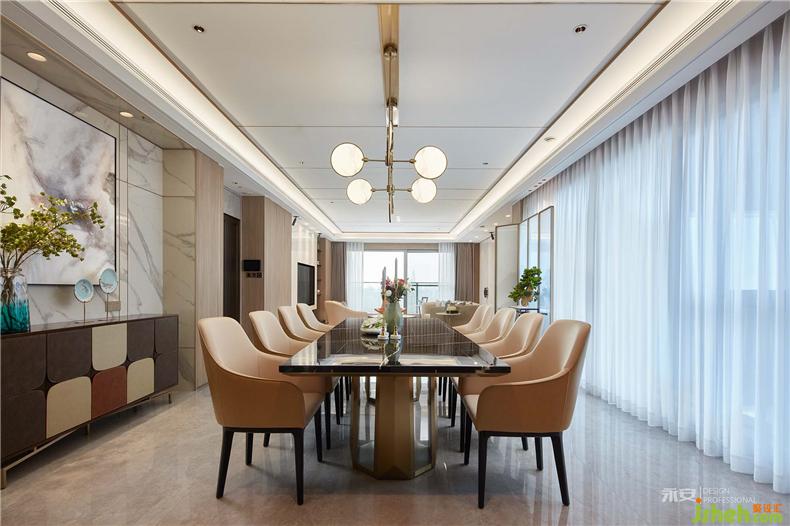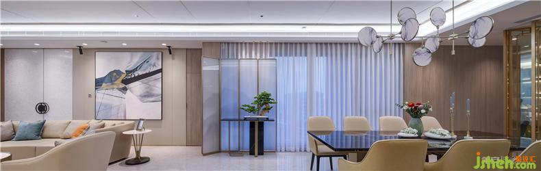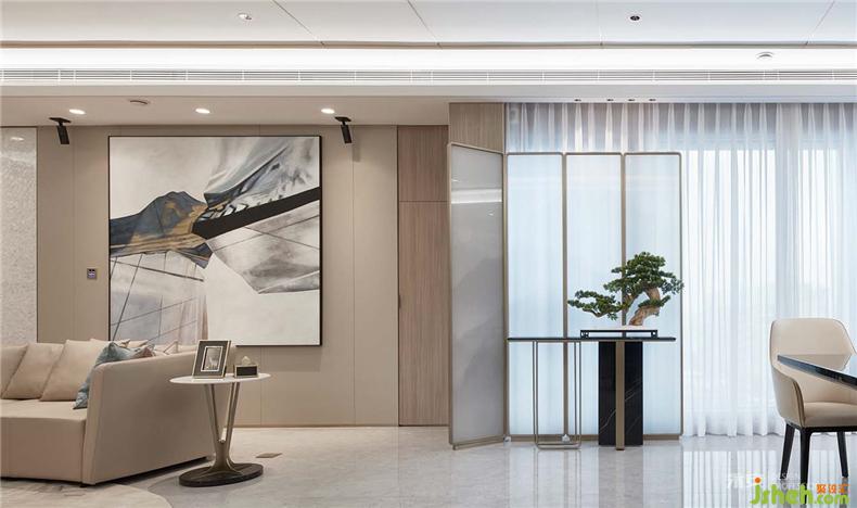 入戶大門的對(duì)面、用餐區(qū)左側(cè)是一扇落地大窗,功能上近似于一面采光充足的透明鋼化玻璃墻,窗體內(nèi)部薄如蟬翼般紗簾可以智能調(diào)節(jié),在陽(yáng)光強(qiáng)烈的正午,能夠過濾掉灑入室內(nèi)的刺眼光線和紫外線,形成一面潔白的光幕,讓白日里的空間氛圍更加舒適柔和。窗前的屏風(fēng)與古松盆飾又為餐廳增添幾分詩(shī)意,餐后的閑暇時(shí)光可以拉開紗簾,與家人靜坐共享窗外的秋月春風(fēng)。