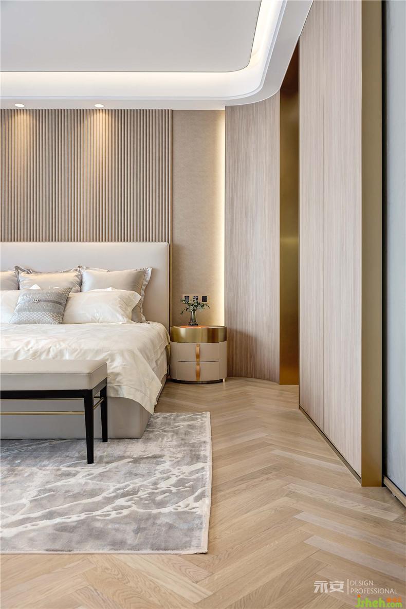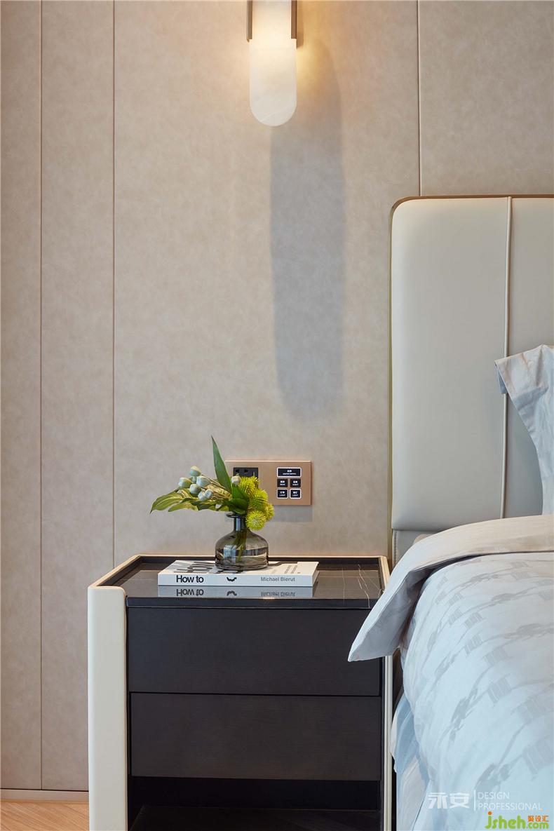 主臥設(shè)計的核心理念在于讓居者每個夜晚平和的入睡,每個清晨溫馨的蘇醒,它需要柔軟、浪漫、富有張力。室內(nèi)設(shè)計師木紋魚骨拼接地板加上木色護墻板,原木色系成為了設(shè)計師的首選,燈帶搭配筒燈的照明系統(tǒng),為主人的夜間生活提供更加舒適的柔性光源。外側(cè)的落地大窗將窗外綺麗的風(fēng)景自然引入內(nèi)部空間,同時,也成為設(shè)計師運用光影交織夢想的筆觸介體。
