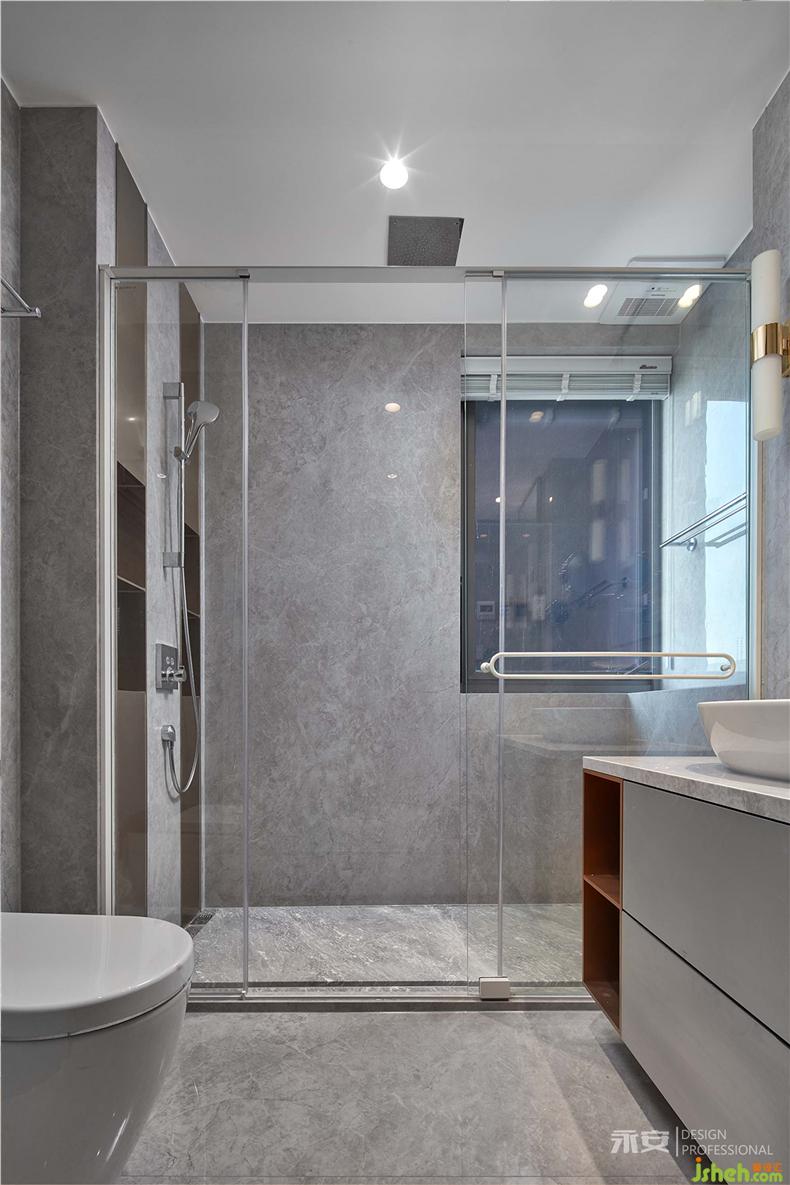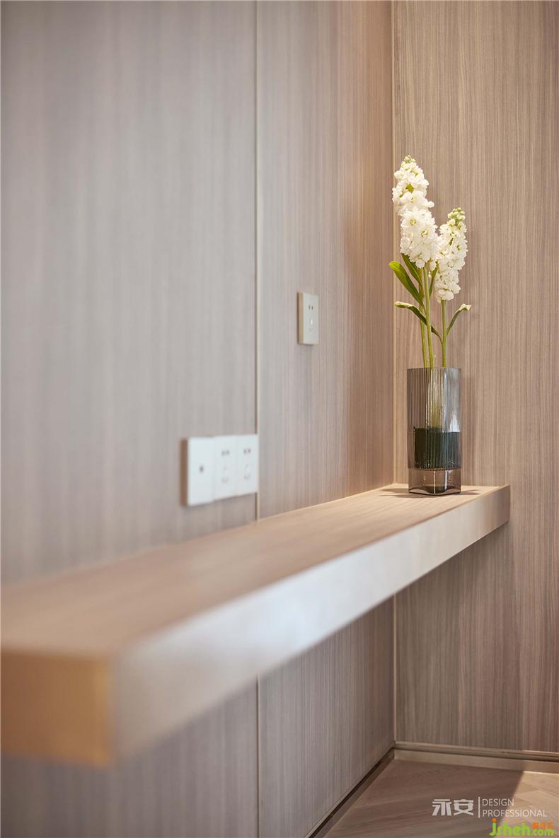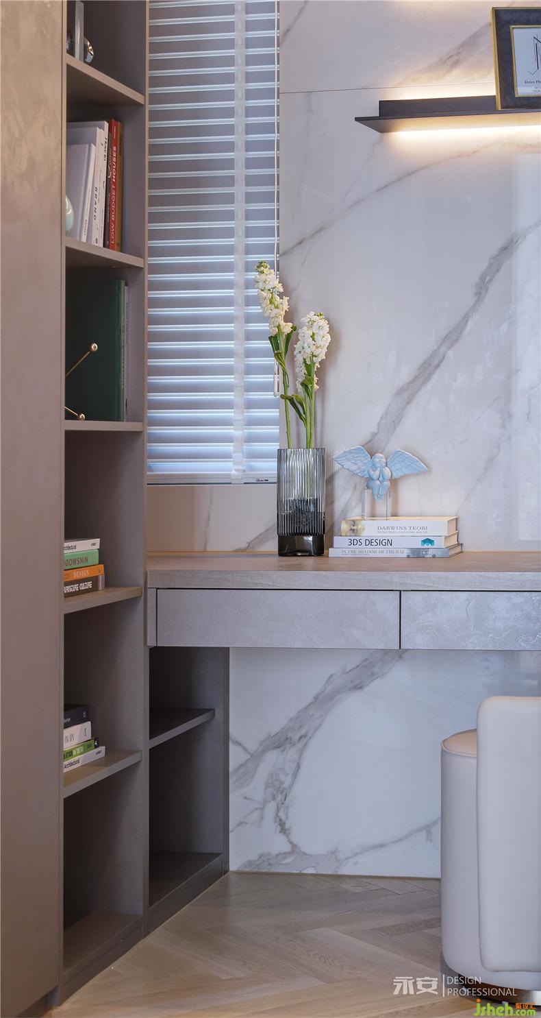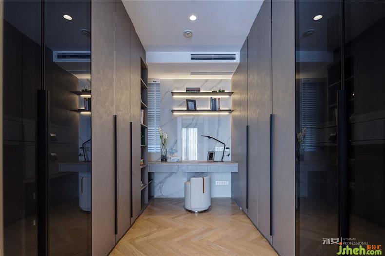 主臥內(nèi)側(cè)是衣帽間和衛(wèi)生間,在延續(xù)整體風(fēng)格連貫性的同時,又根據(jù)區(qū)域的功能劃分對設(shè)計元素進行了調(diào)整。衣帽間以左右兩排頂天立地的衣柜為主體部分,空間利用率最大化的同時,規(guī)整的幾何造型與背景墻完美混搭;室內(nèi)設(shè)計師衛(wèi)生間的墻面和地板以整塊灰色巖板鋪陳,視覺效果清潔爽朗。