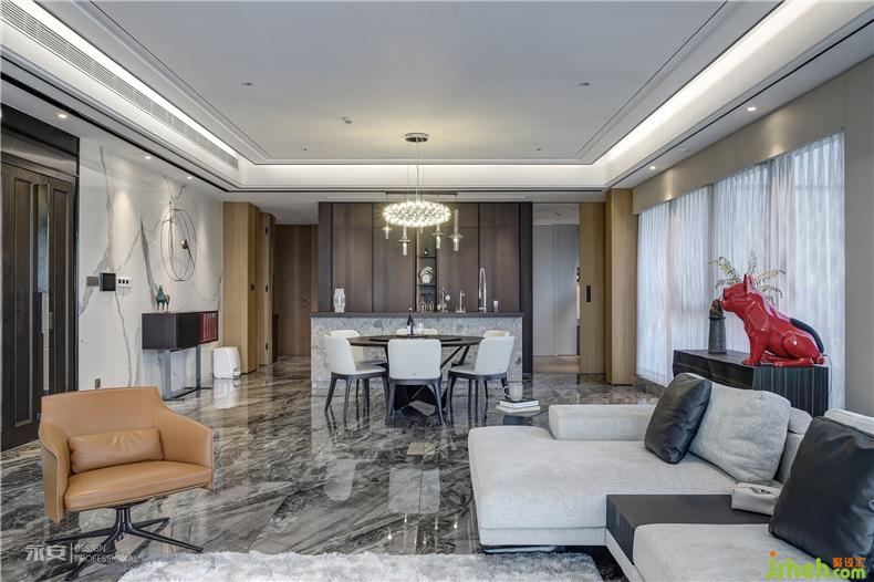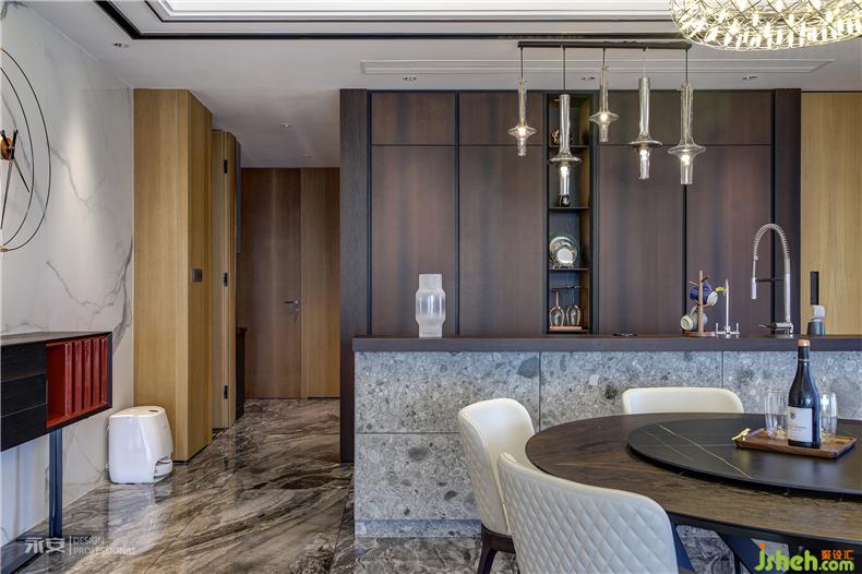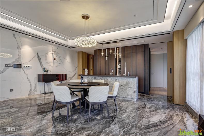 視線從客廳延伸至餐廳,以圓形餐桌為中心,格局與色彩都十分注重對(duì)稱平衡。吊燈簡(jiǎn)致而典雅,璀璨的光芒照耀下方,一切的一切都顯得秀色可餐
