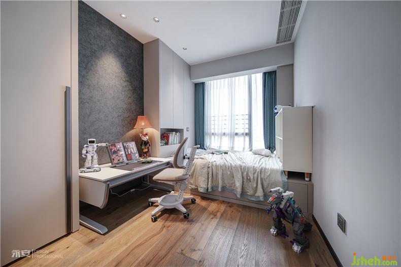 “家庭盛弦誦,父子相師友”,受父親的影響,小男孩也酷愛(ài)著科技風(fēng)與機(jī)甲風(fēng)。床頭的小櫥窗,擺放著他愛(ài)讀的啟蒙書籍;床尾的櫥柜,用來(lái)陳列孩子的機(jī)甲雄師