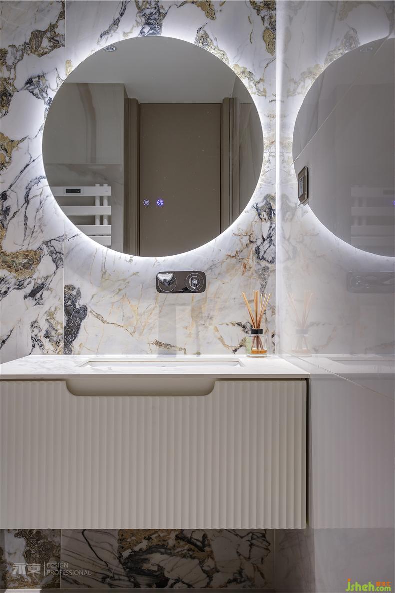 深灰色和暗金色的紋理斑駁交織,在米白色的護(hù)墻板上渲染出鬼斧神工般的自然藝術(shù),圓形鏡面之后,是集美觀與實(shí)用于一體隱藏?zé)魩?,所有的美好在它面前將無(wú)所遁形