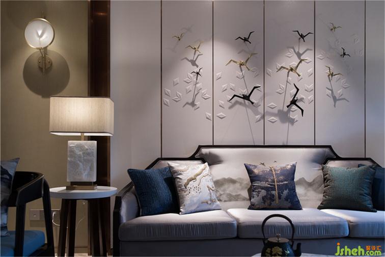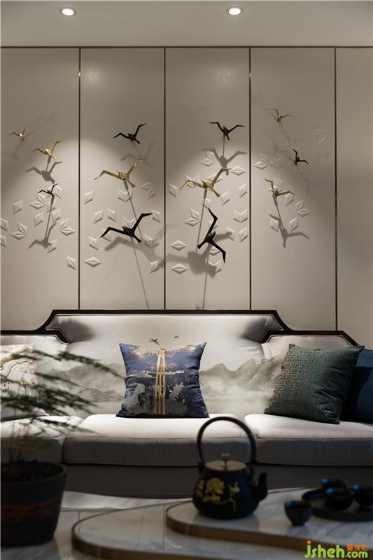 沙發(fā)、背景墻運用山水圖案,作為整個空間的色彩及主題點綴。