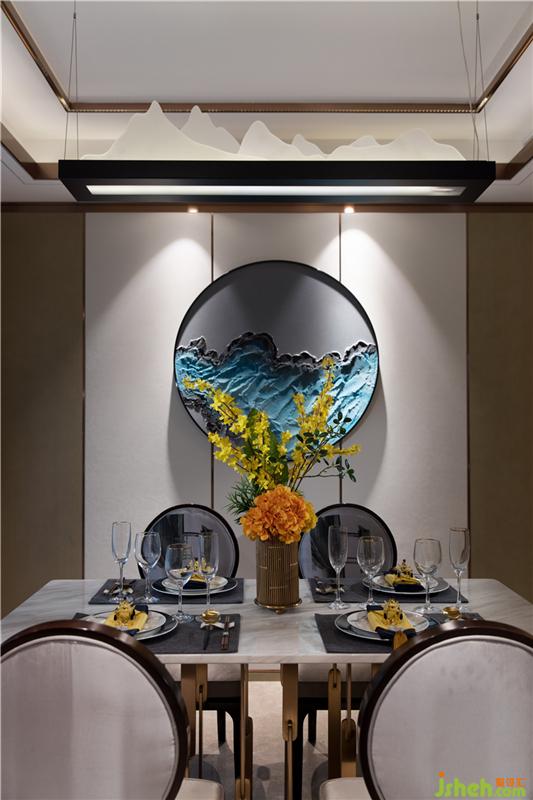 背景墻畫飾中一抹淡雅綠的點綴恰到好處,營造一個溫馨而優(yōu)雅的餐廳氛圍。