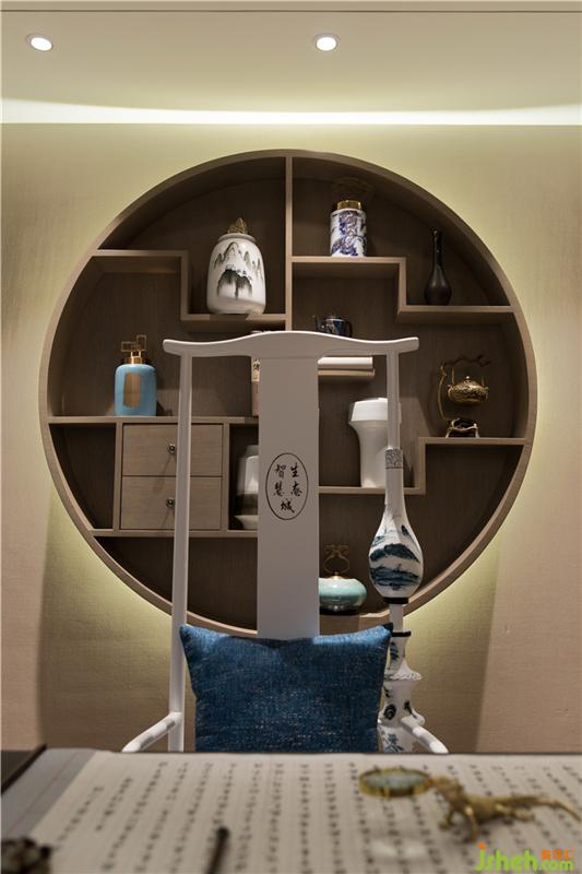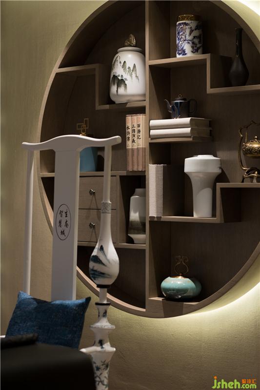圓形實木置物區(qū)鑲嵌于背景墻面,若即若離,間隙中透出光暈,有日出日落的寓意。