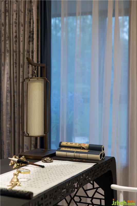 窗簾運用傳統(tǒng)山水圖案掛簾,呼應(yīng)主題,作為室內(nèi)外空間的一個延伸。