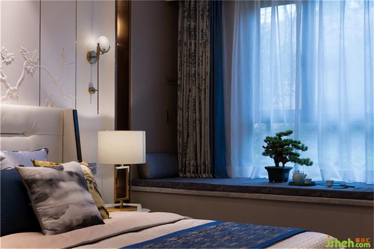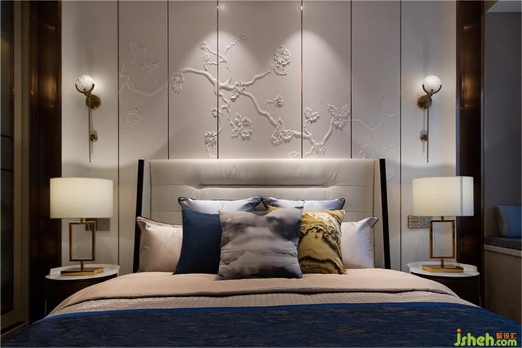 臥室床頭背景運用自然葉狀圖案皮雕,現(xiàn)代化處理,豎向分割,增加設計感。