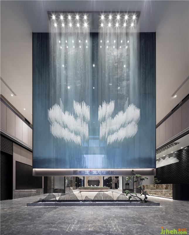 LED屏展示的瀑布飛流直下水景與水景燈飾裝置呈現(xiàn)的抽象山峰輪廓,則暗示了項(xiàng)目好山好水的地理優(yōu)勢,讓觀者于前廳獲得來自于環(huán)境的第一重俘心體驗(yàn)。