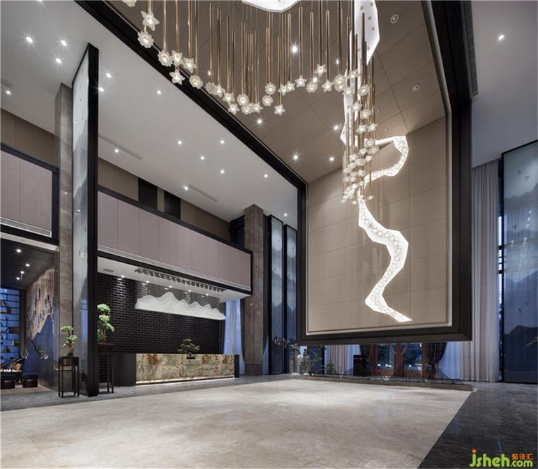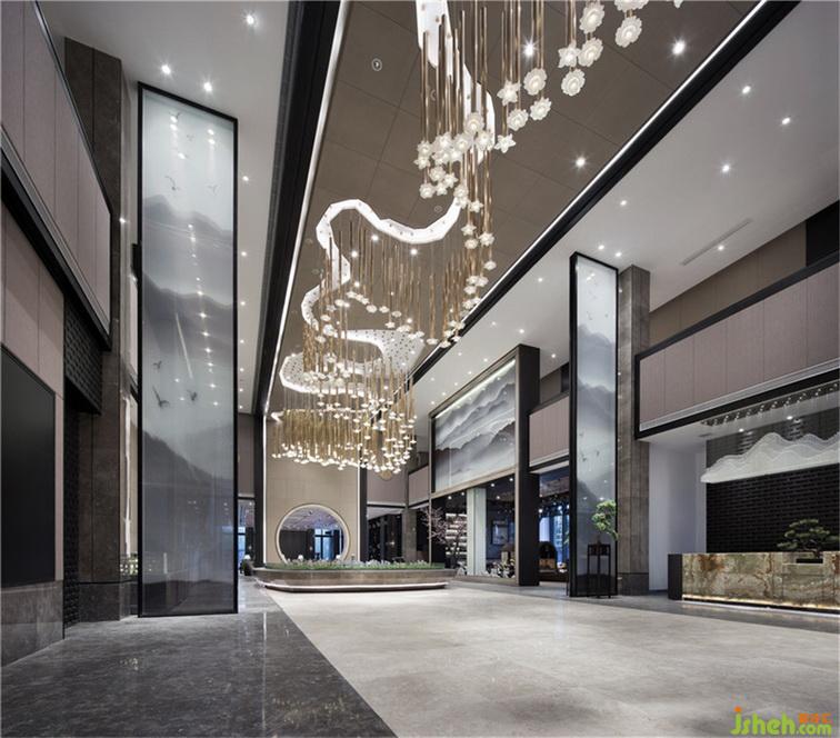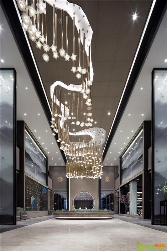 前臺接待區(qū)采用云石、水晶疊山水燈飾體現(xiàn)空間質(zhì)感及項(xiàng)目檔次。