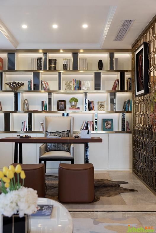 安道爾棕實(shí)木書桌和皮革面料坐凳的組合,凸顯一種時(shí)尚精致的工藝品質(zhì)感,香檳金金屬屏風(fēng)和書架邊框線條,共同勾勒出尊貴高級的空間層次感。