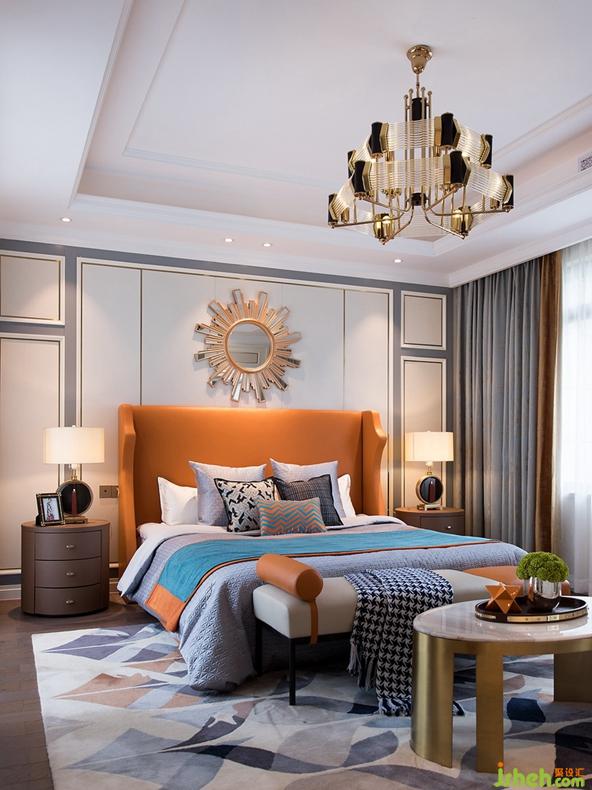 餐廳的在整體色調(diào)和材質(zhì)選擇上,與客廳相互呼應(yīng),橙色的皮革材質(zhì)椅子、香檳金圍起的大理石圓形餐桌以及豪華水晶吊燈,共同組成餐廳的主要場景。