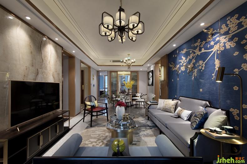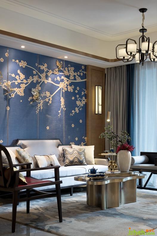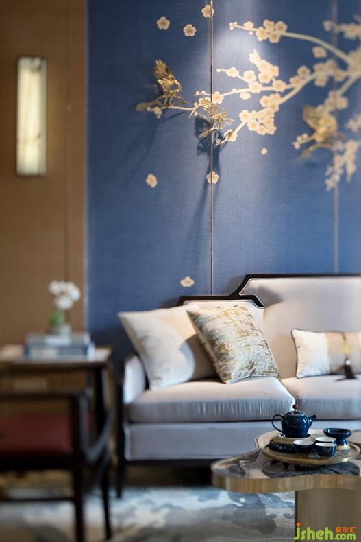 大面積的藍(lán)色背景墻清新而淡雅,數(shù)枝白色的梅花勾勒恰到好處,既不孤靜也不濃烈。