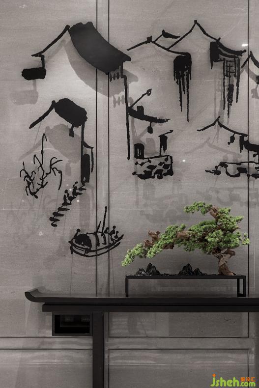 拼紋玉石大理石墻面立于中間,兩邊虛實結(jié)合的立體式木格柵營造出山城的印象,于不同角度呈現(xiàn)不同的立體效果;右側(cè)以園林白色細(xì)石結(jié)合松屬植物形成獨特的人文景觀,為前廳增添了盎然綠意和生機。