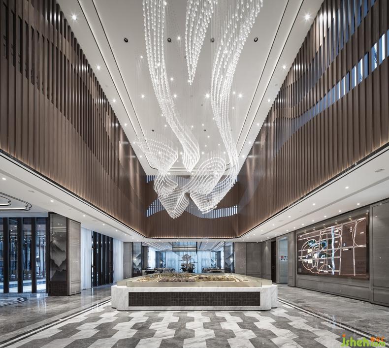 步入前廳,雅致的中式風(fēng)情和靈透的人文氣息融為一體,接待臺采用拼紋玉石背景墻面,以植物果實為元素設(shè)計的吊燈自由懸掛組合,整體空間通透大氣而不乏靈動寫意。