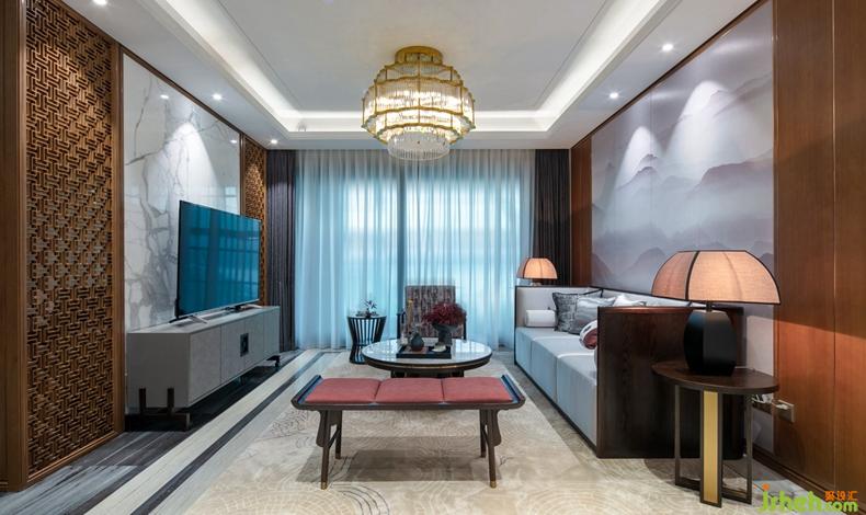 電視背景墻采用大面積的魚肚白水墨紋大理石,如同東方破曉的天際,有一種白玉般的光澤和靜謐。