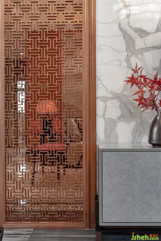 旁邊佇立著木花格屏風(fēng)隔斷墻,內(nèi)部鑲嵌著茶鏡,為空間增添反光效果和靈動(dòng)性。