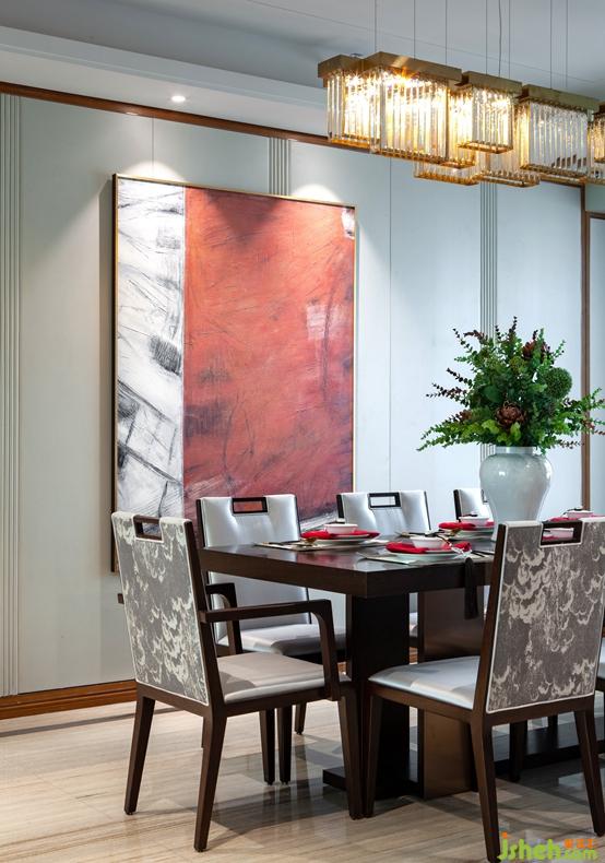 移步餐廳,墻面搭配大面積的白色皮革硬包,簡練大方,在燈光的渲染下營造出豐富的光影效果,使空間更具美感。