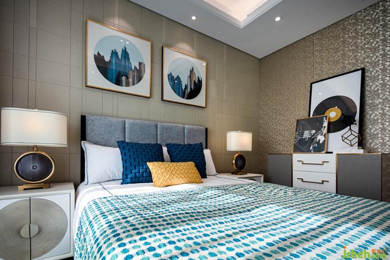 主臥床頭背景中間運(yùn)用花繪皮雕結(jié)合兩邊延續(xù)客廳花格圖案的定制藝術(shù)鏡面玻璃,體現(xiàn)空間整體性,并利用玻璃的微反射,使空間更具層次與開闊感。