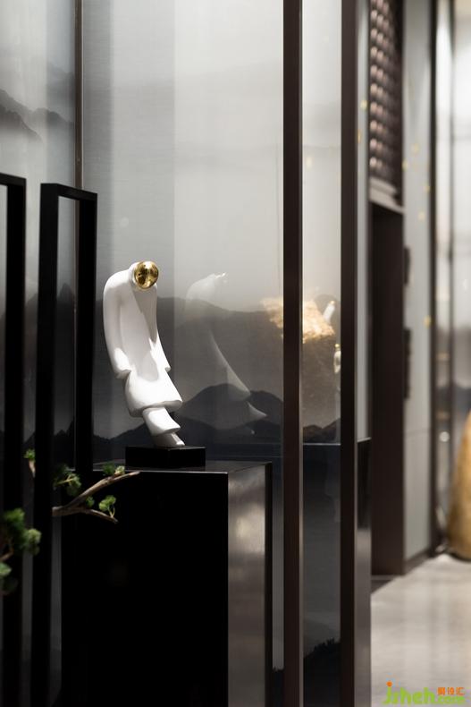 層板陳設(shè)注重疏密程度的錯(cuò)落擺放,通過古韻造景賦予空間文化底蘊(yùn)感,同時(shí)隔而不斷,打造移步換景的園林式布局。