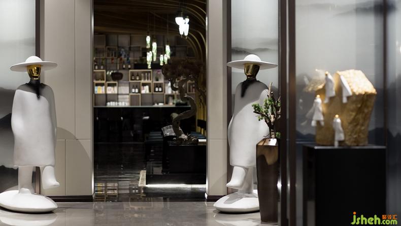 本案售樓處由兩棟建筑連接而成,中間通過連廊銜接,人形雕塑是穿梭時(shí)空的使者,連接過去與未來,傳遞湖湘文化中“敢為天下先”的精神氣概。