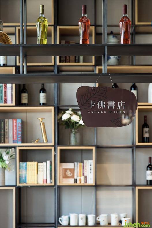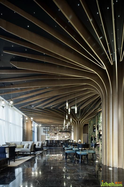 連廊另一頭是承擔(dān)本案休閑功能的咖啡書吧,放射形線條讓兩顆生態(tài)樹成為整個(gè)書吧的視覺焦點(diǎn),配合墻面綠植裝飾,意在強(qiáng)調(diào)生態(tài)自然的人居環(huán)境所帶來的輕松愜意。