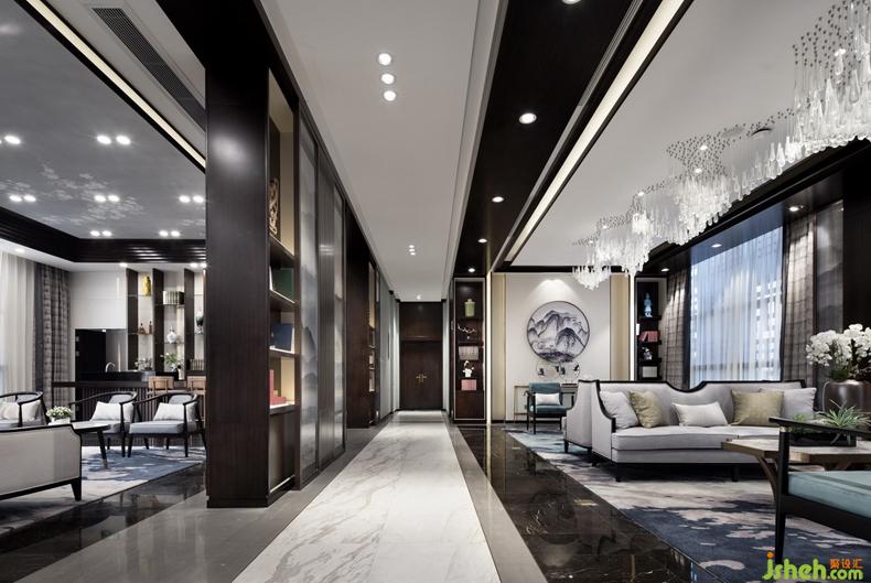 售樓部二層為兩個(gè)主要洽談區(qū),利用舒適的沙發(fā)軟墊觸感及新中式靠椅精致與古韻,同時(shí)于空間中融入抽象的山川元素,打造出洽談區(qū)的尊貴感。