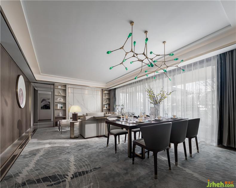 踏入客餐廳空間,設(shè)計師通過藝術(shù)的手法抒寫著東方美學(xué)與藝術(shù)交融,棕色調(diào)木飾面帶著暖意與沉穩(wěn),樣板房設(shè)計加之灰、藍(lán)調(diào)家具布藝,皮質(zhì)與綢緞帶來不一樣的觸感,地毯肌理描繪出水波蕩漾的波瀾,如同巖石溶洞的時間記憶,已然超乎于生活之上。