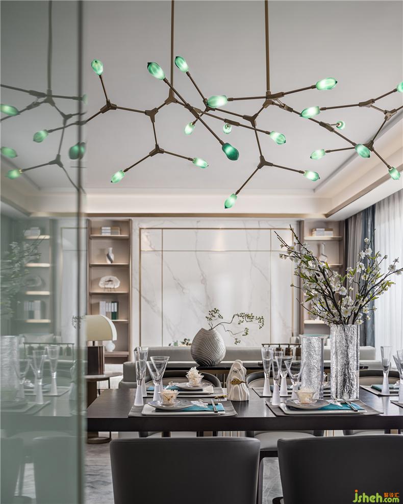 兩尾錦鯉,在設(shè)計師的巧心創(chuàng)作中以游曳于空間里,穿梭于飾品擺件中“河床水藻”間,樣板房設(shè)計天然山水紋路大理石更添溫潤,組合呈現(xiàn)三維立體的視覺印象,聽著空間中帶來的輕緩國樂,是純粹細(xì)致的藝術(shù)體驗,回歸生活的本質(zhì)享受