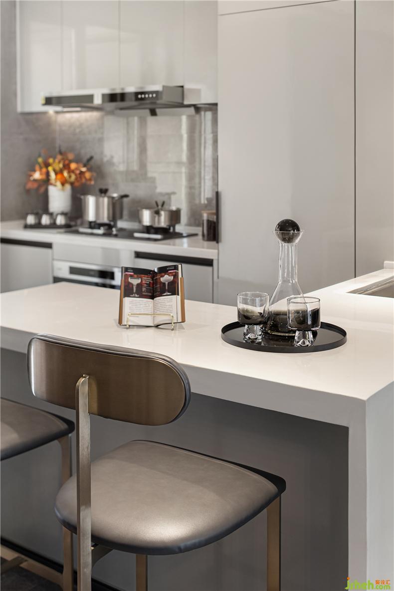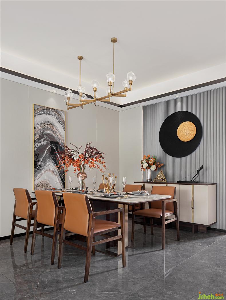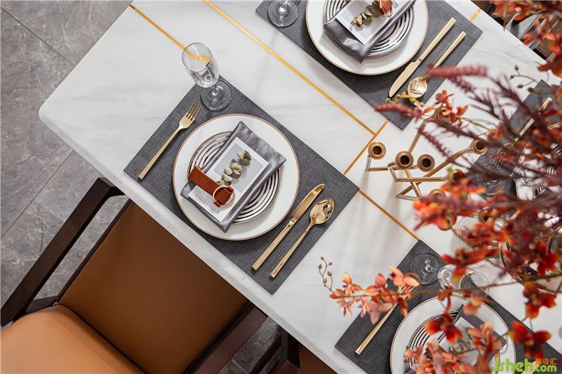 天然大理石臺面搭配具有裝飾線條感及簡約、節(jié)省空間的桌腳設(shè)計(jì),樣板房設(shè)計(jì)有助于于餐椅的擺放使用方便性
