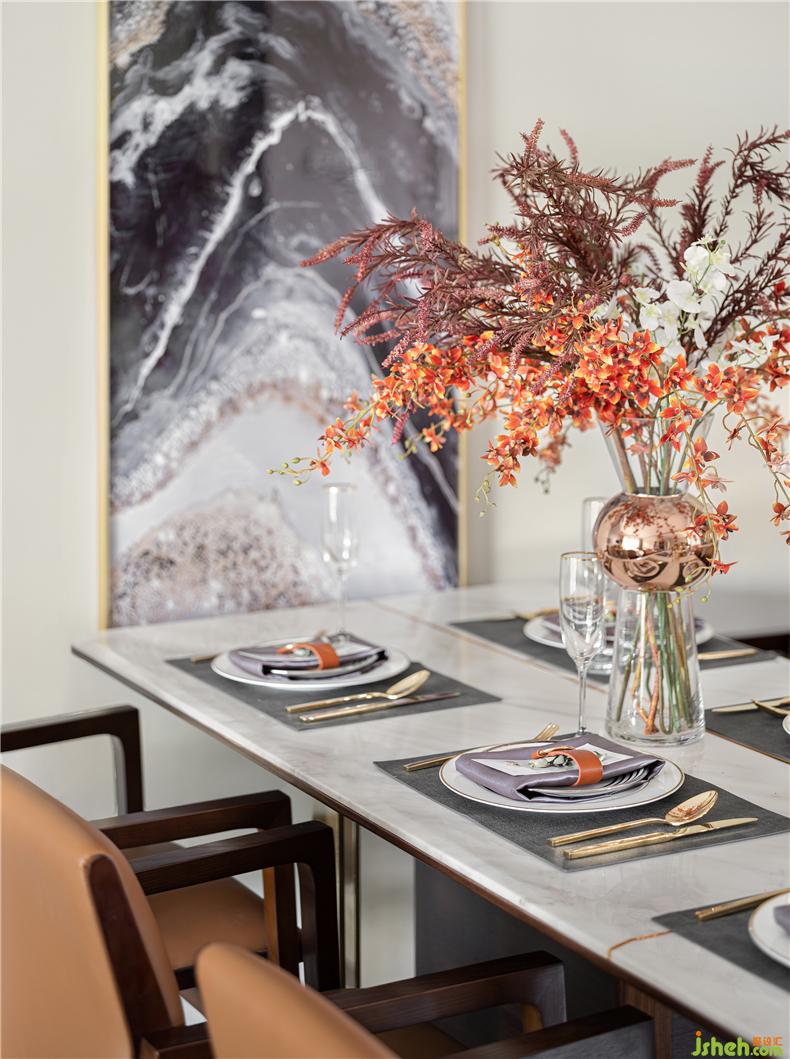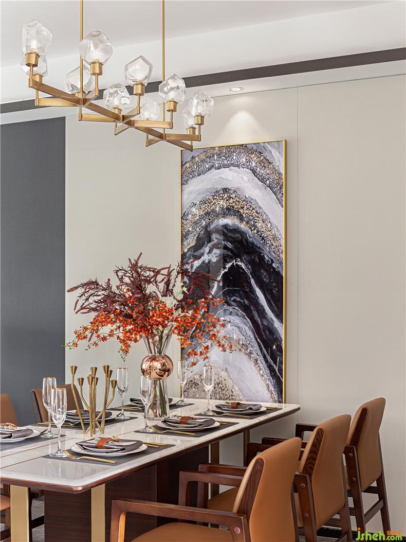 開闊明餐廳,軟裝設(shè)計(jì)強(qiáng)調(diào)審美在外質(zhì)感在內(nèi),與客廳同源的背景裝飾畫為空間注入輕盈靈動氣質(zhì)。充滿設(shè)計(jì)感的餐桌、餐椅傳遞優(yōu)雅儀式感,醞釀出現(xiàn)代詩意。