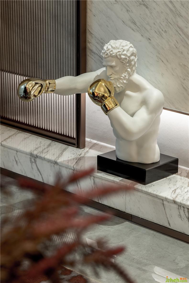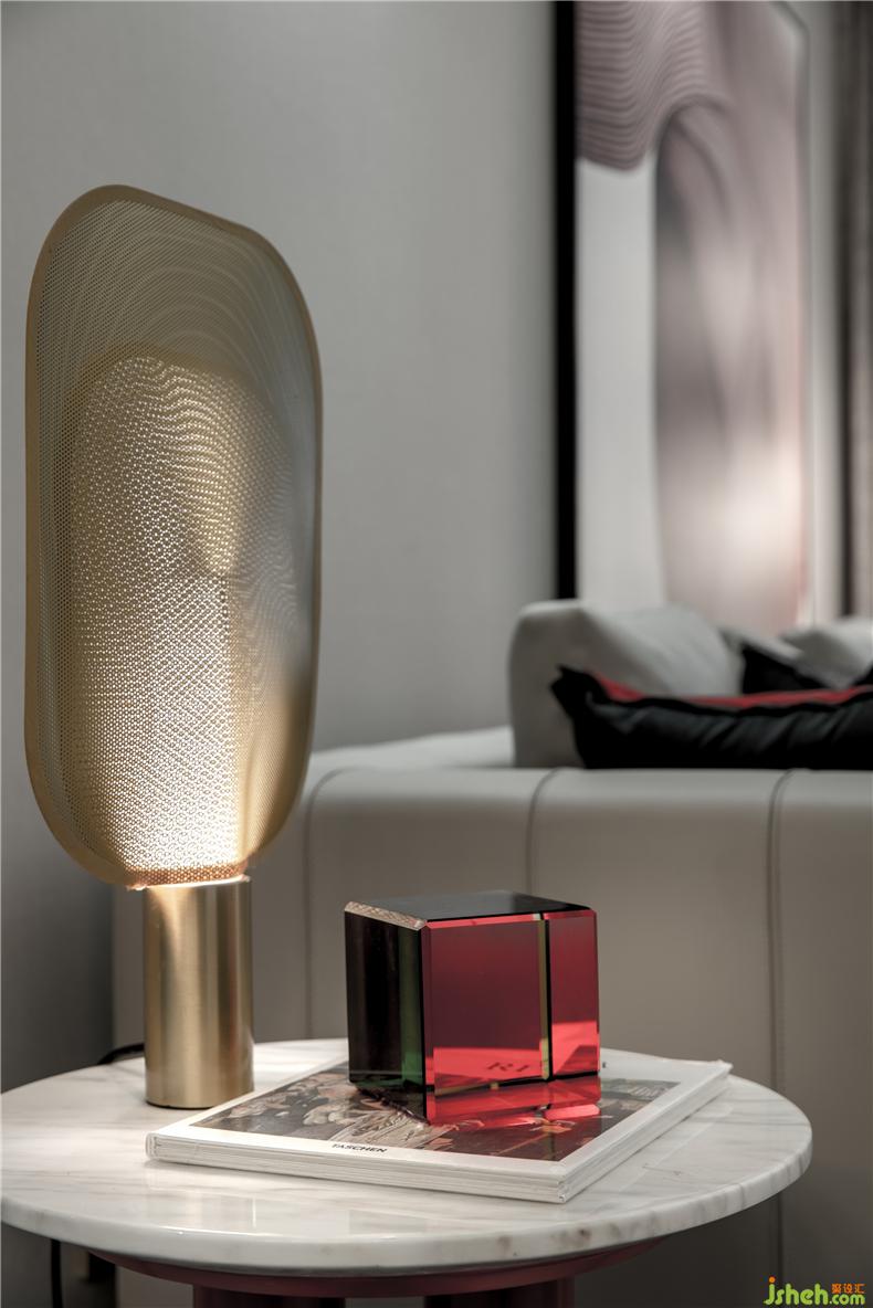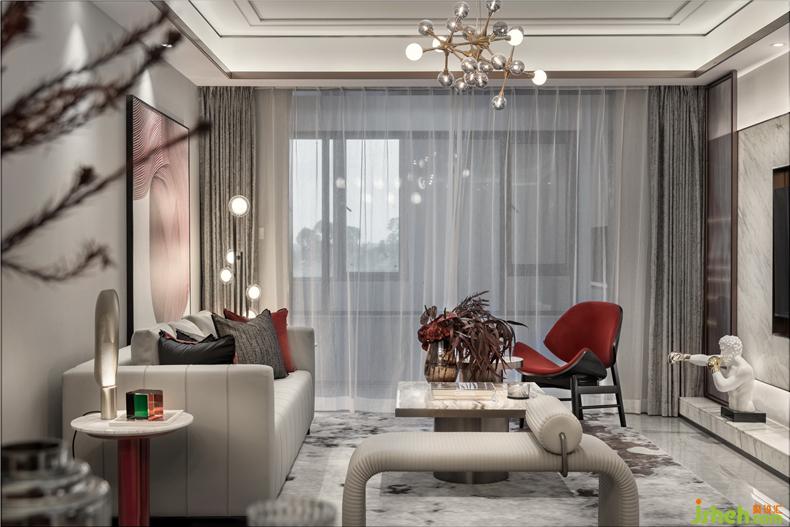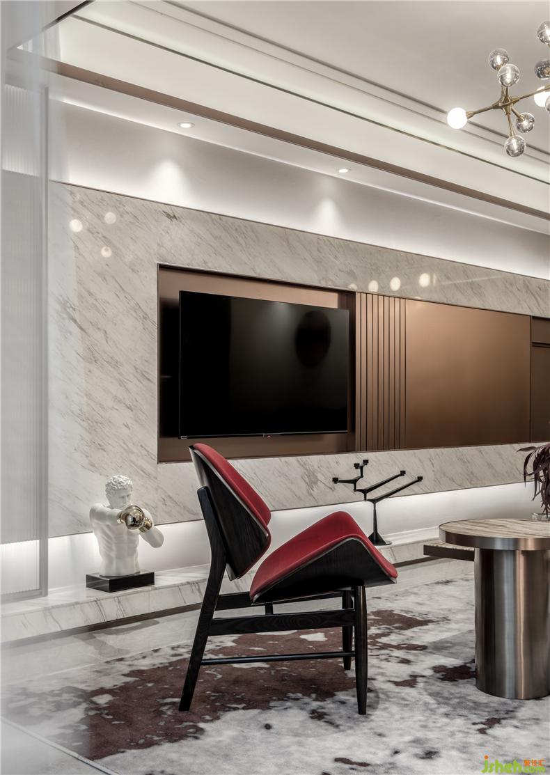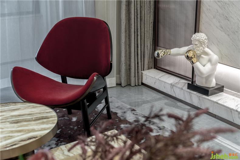 空間中石材和金屬的張力,感受利落質感,干凈冷冽的空間增添一些柔和質感。紅白用色,樣板房設計內斂雅奢;柔軟的布藝和精致的配飾達成陰陽平衡的調和。增加了底色的豐富和柔和,朱砂色元素的使用使空間多了幾分復古典雅。