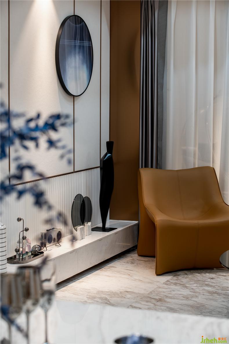 在軟裝陳設(shè)上,灰白基調(diào)配以深邃睿智的代爾夫特藍作為空間色彩跳躍,樣板房設(shè)計搭配香檳金屬材質(zhì)不銹鋼細節(jié),打造一個具現(xiàn)代臻品的迷人空間。