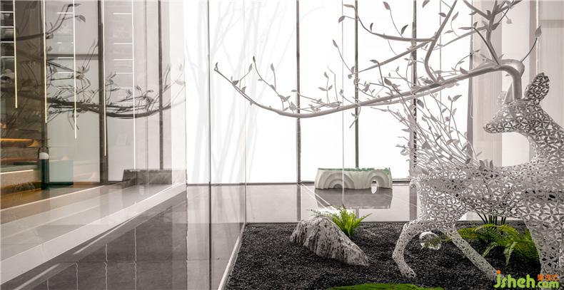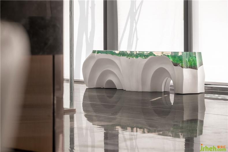 代表生機的綠色讓空間節(jié)奏跳躍,一旁置放著玻璃鋼與手工樹脂制作的科技琥珀長凳,營銷中心設計打破大空間的沉悶,提取低飽和的森林色彩,搭配動物與植物的形象提取、元素組合,自然柔和,舒適干凈