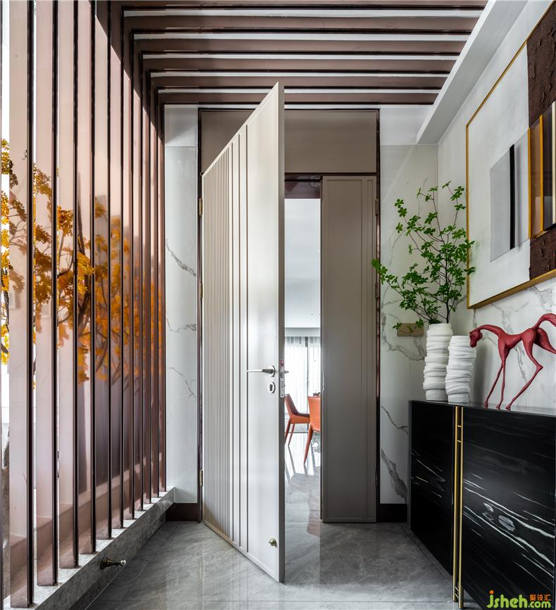 進(jìn)門處的設(shè)計采用戶外玄關(guān)造景,將日常鞋具放在進(jìn)門處也是一個很不錯的選擇,左手邊用格柵將茶室和室外的景觀相結(jié)合,達(dá)到半透不透的意外效果。