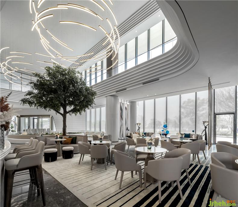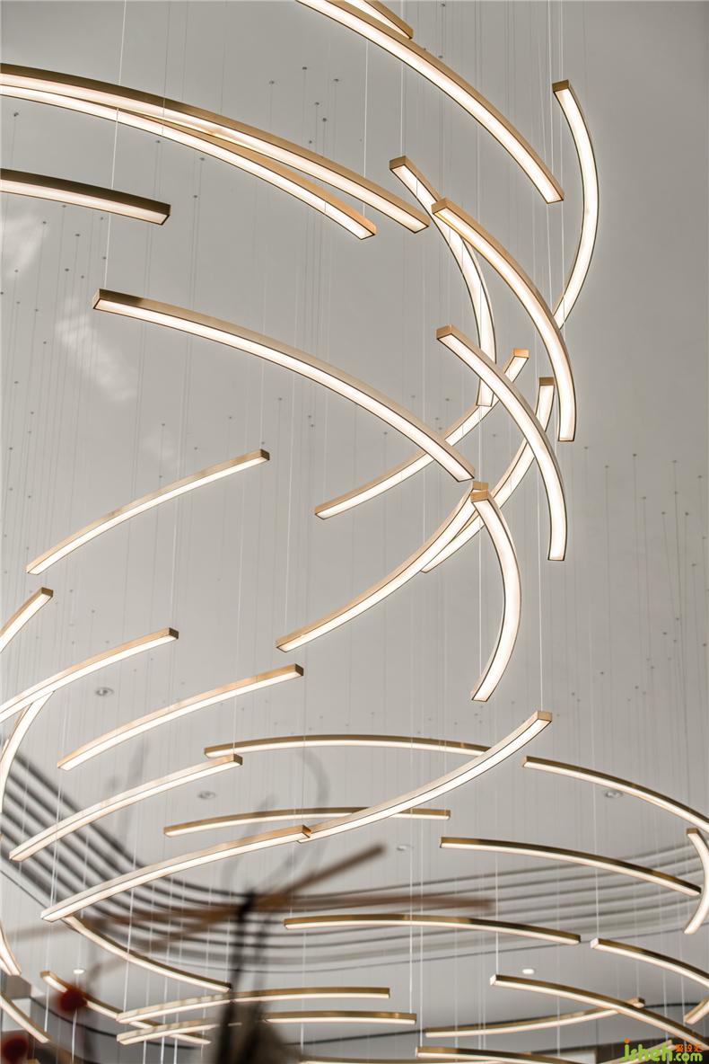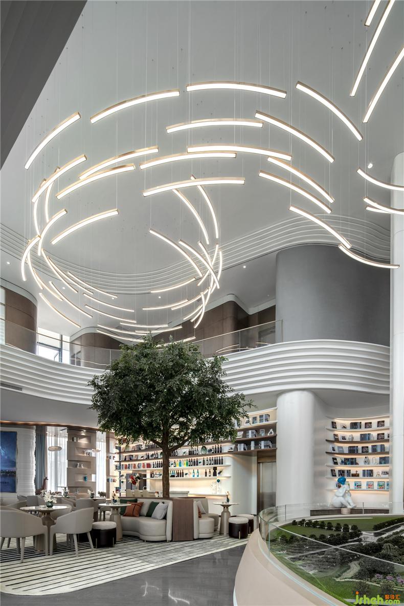 銜接一二層之間的是一盞巨大的藝術(shù)吊燈,橫貫洽談區(qū),以水波紋為設(shè)計(jì)靈感,用藝術(shù)的手法,抽象的表現(xiàn)水流形態(tài),給人留下視覺震撼。以水便以水為媒介,藉由自然光影與建材紋理, 捕捉水波的藝術(shù)姿態(tài),注入設(shè)計(jì)理念, 并將其貫穿在空間當(dāng)中,讓人留住當(dāng)?shù)氐乃洃洝?
