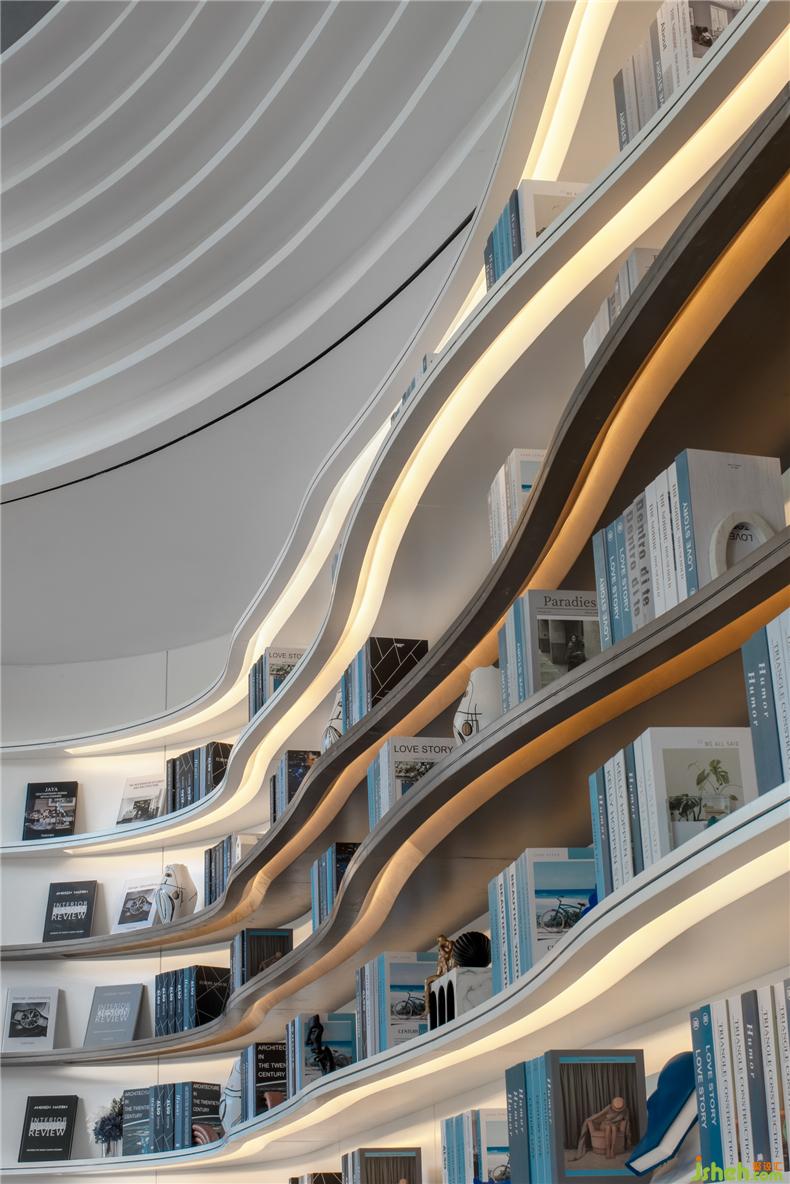 書吧空間都是開放式的,在書墻的下方還有同樣波紋形狀的可入座臺(tái)階,供閱讀者稍作休憩,拉近人與人之間的距離。在臺(tái)階的一側(cè)更是矗立著一個(gè)活潑可愛的卡通小熊IP裝置,讓不管是成人還是孩童都能在書吧享受到逃離都市喧囂的片刻寧?kù)o。