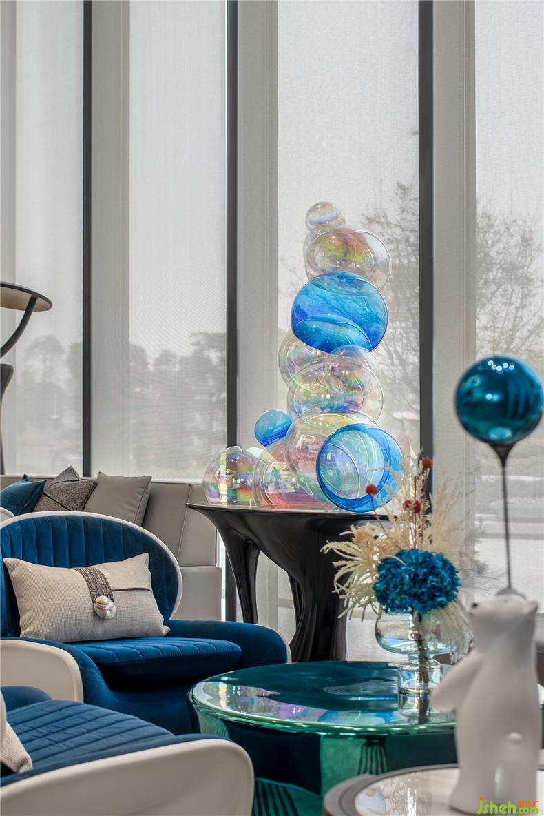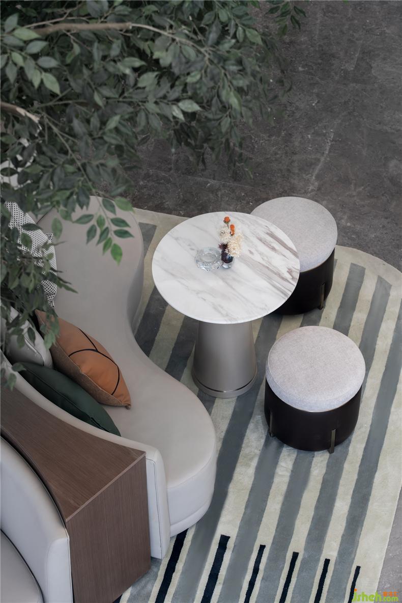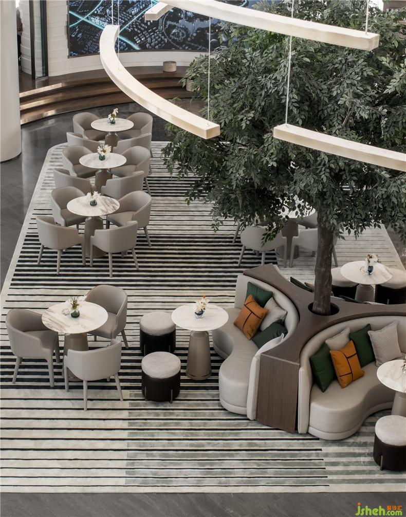 從二層往下,透過大型水波紋吊燈,商務洽談區(qū)的卡座若隱若現(xiàn),大理石材質的臺面泛著微光,實現(xiàn)鏡像與空間的交融,在綠茵的映射下,充盈自然的趣味。