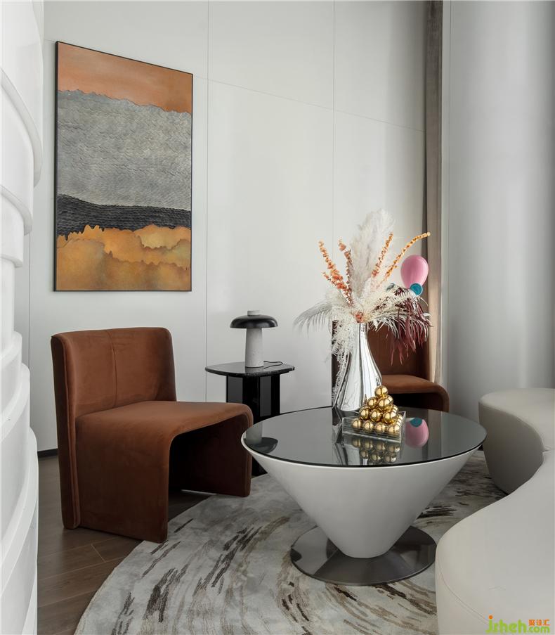 VIP室分為兩間,以橙色為主VIP室溫暖柔和,利用空間特點設計曲線型沙發(fā),順應空間特點設計。網紅倒錐形茶幾搭配炫彩花瓶,深棕色的啞光質感沙發(fā)與同色系的皮革裝飾畫相互呼應,再點綴上卡通小熊IP的立體裝置,通過這樣的設計手法,將整個空間合為一體,色調活潑又不失沉穩(wěn)。