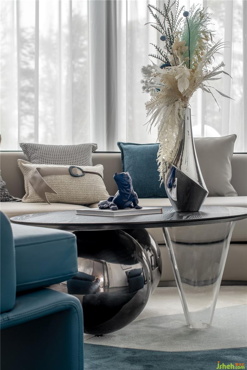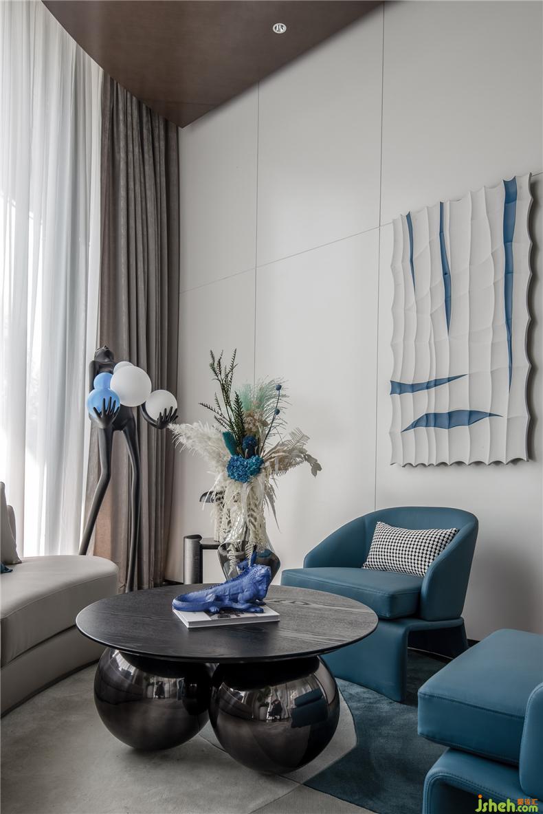 以藍(lán)色為主的VIP室,沉穩(wěn)大方,讓置身其中的人能享受到安逸的談話氣氛,充盈幾何感的的茶幾與現(xiàn)代感單位沙發(fā)結(jié)合為空間增添了時尚感,網(wǎng)紅藝術(shù)落地?zé)舸钆淞Ⅲw木雕裝飾畫為空間增添了活躍感,置于桌面的藝術(shù)炫彩花瓶折射空間的色彩,營銷中心設(shè)計更是其中的點睛之筆,大氣美觀。