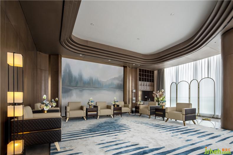 VIP貴賓室充盈原木色調(diào),以深棕色為主,波紋狀的地毯點綴其間,大氣典雅。營銷中心設(shè)計形制規(guī)整的真皮沙發(fā)整齊擺放,交流區(qū)、茶水區(qū)分區(qū)明顯,盡顯尊貴之感,浪漫自然。