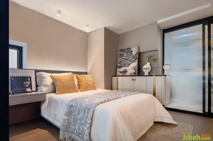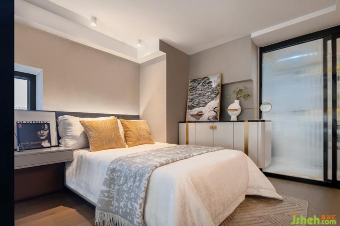 客臥以紅色為主題,將大色塊與不同紋理的圖案調(diào)和得相得益彰,舒適簡(jiǎn)潔。公寓樣板房設(shè)計(jì)師把金屬光澤蔓延到了這里,與客廳風(fēng)格遙相呼應(yīng)