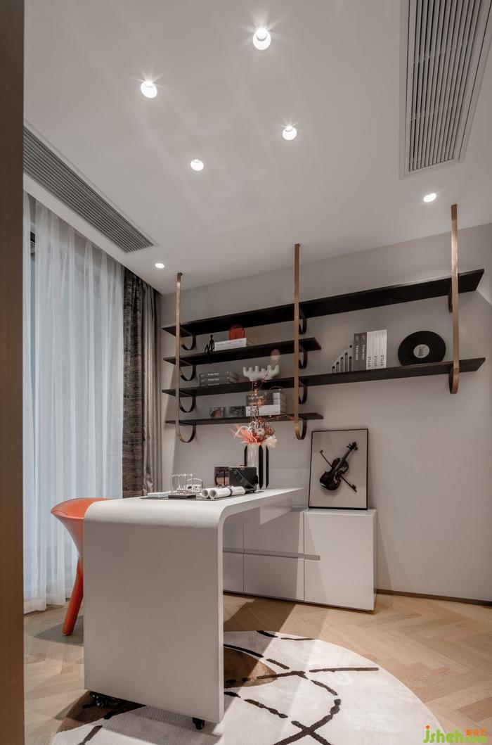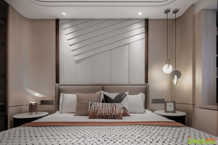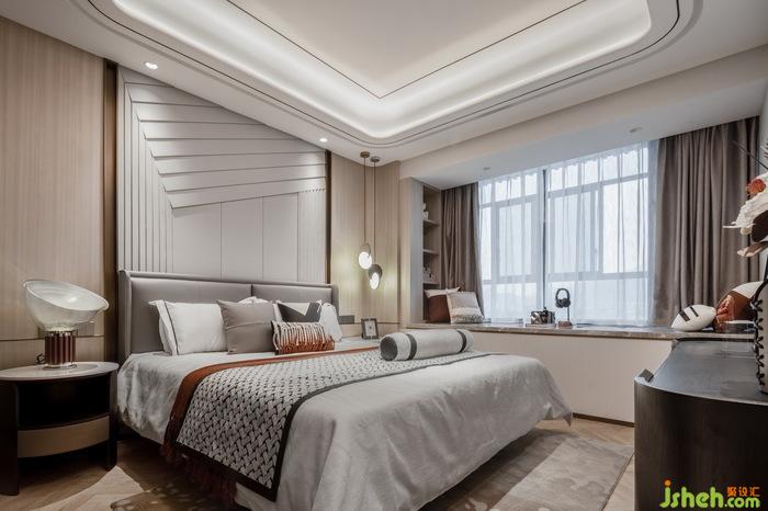 主臥整體色調(diào)偏暖,床上皮革與棉麻的質(zhì)地中流露出溫馨與幸福感,樣板房軟裝設(shè)計床尾的收納柜兼顧著功能性與美觀性。這里是身心的最終歸屬,在這放松直至第二天的清晨陽光撒入房間,放松時坐在明媚舒適的飄窗好不愜意。