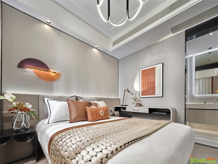 設計師在次臥的設計上,簡約而又不失創(chuàng)造力和對實際需求的細致考慮,樣板房設計使用漂浮床的設計,更好的把空間融為一體,而床頭靠背與床頭柜、邊柜相連,充分利用了空間,軟飾的配色予以不同層次的橙,加了空間層次感。