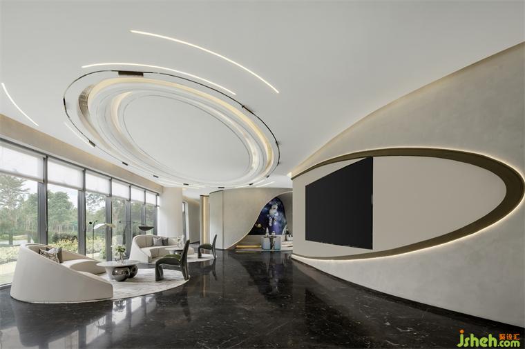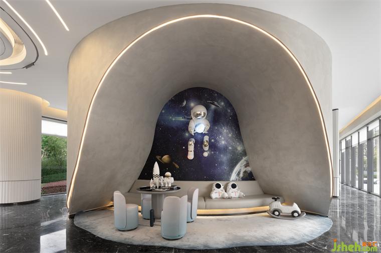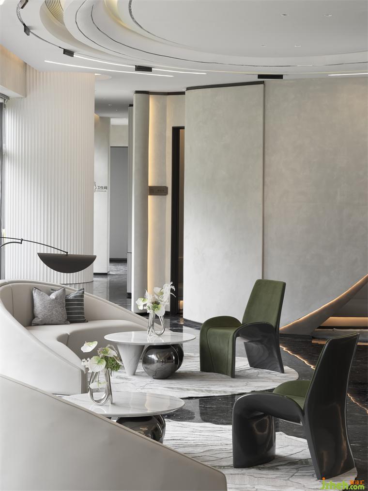 乳白的異形沙發(fā)、灰綠色的單人椅、售樓處設(shè)計淺色的大理石臺面圓桌與地毯,一切都是那么和諧柔美,讓人的身心似乎也得到了放松。