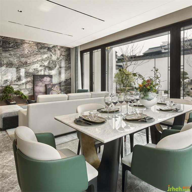 餐廳與客廳視覺平坦開闊,廚房通透與私密性隨意切換,讓空間視野更加通亮。別墅軟裝設計餐廳餐桌采用大理石臺面,高低錯亂的現代設計語言,展現行云流水的優(yōu)雅尺度。