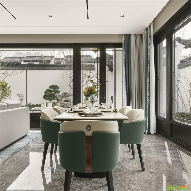 當陽光透過紗簾均勻柔和地鋪在餐廳里,家人圍坐于餐桌前,別墅軟裝設計花藝點綴三餐四季的溫馨氣息,天然石材的紋理與高級灰的結合,跳脫出盎然生機的翠色,沉穩(wěn)內斂的皮質餐椅,襯得整個空間的精致感油然而生。