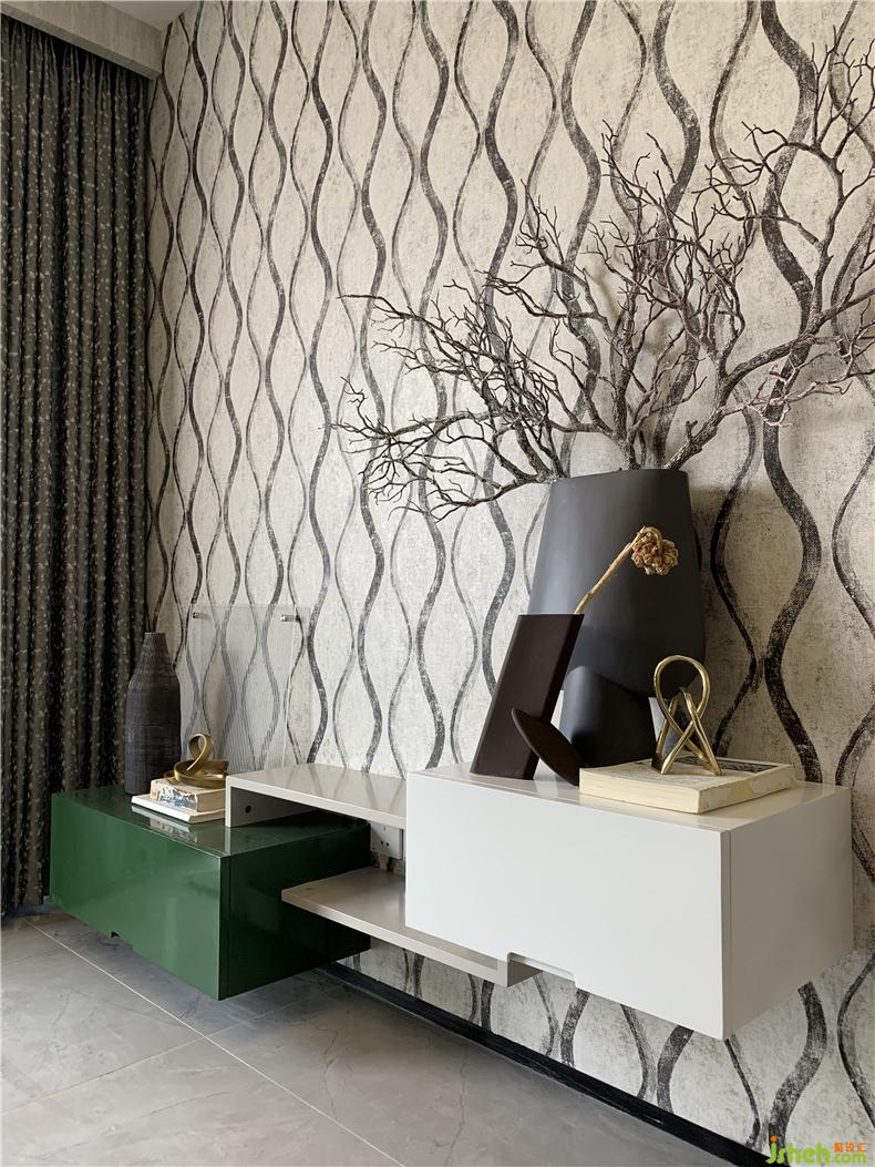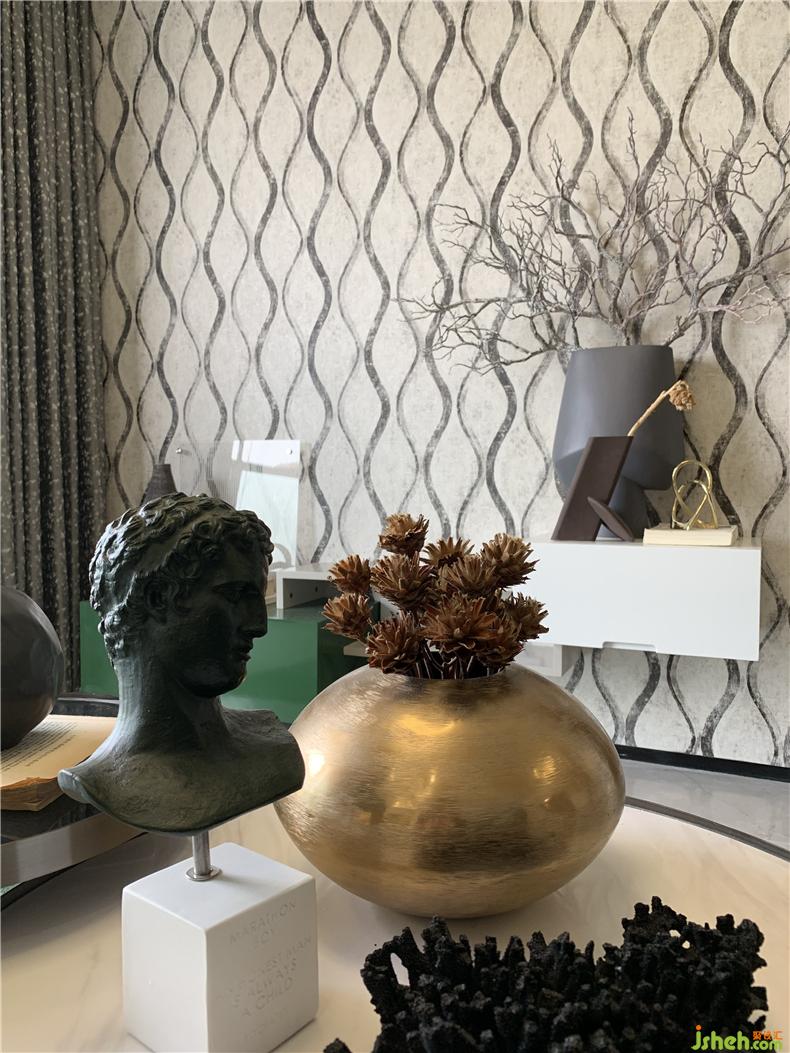 大面積的大地色調(diào)壁紙營(yíng)造自然氣息,灰色花器和金屬擺件的碰撞,