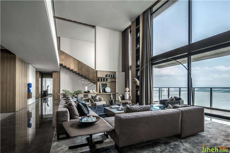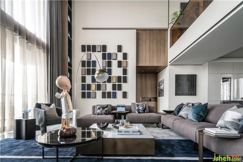 步入客廳,便是另一方天地,雙層挑高高度采用大幅的落地窗設計,組合的藝術畫作拉伸了空間的縱深感,引入自然光,大理石紋的Meridiani茶幾、低飽和度的意大利Henge沙發(fā)及單人椅,樣板房設計再融入Minotti的休閑椅顯得低調(diào)而純粹,在滿足使用需求的同時增加空間的通透性。